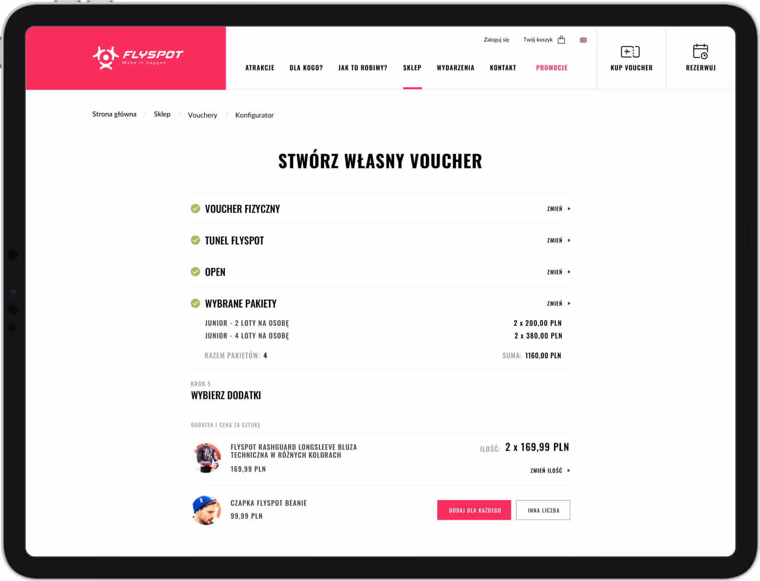 W ramach projektu stworzyliśmy również wewnętrzny system e-commerce, w którym goście mogą kupić pamiątki i ubrania firmowe FlySpot.