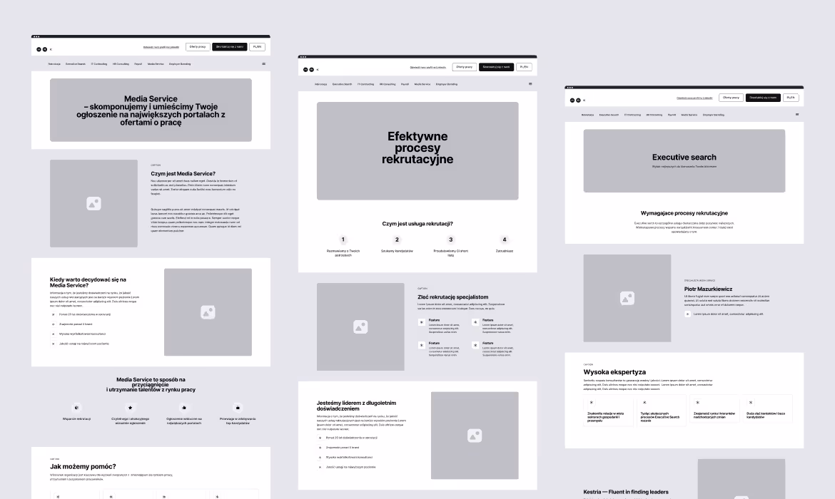 Architektura informacji powstała na podstawie realnych potrzeb dwóch grup odbiorców: klientów poszukujących wsparcia HR oraz kandydatów poszukujących pracy. Projekt objął zaprojektowanie zupełnie nowych ścieżek użytkownika, zależało nam, by treści były podane w jak najłatwiejszy sposób.