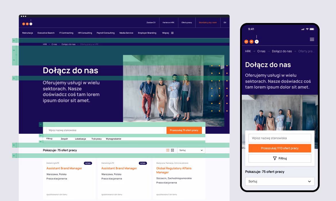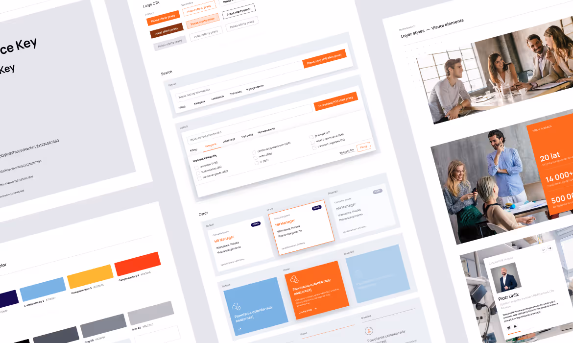 Projekt został oparty o elastyczny design system, który pozwala zespołowi HRK swobodnie rozbudowywać stronę i tworzyć nowe treści. Opracowaliśmy również odświeżoną identyfikację wizualną, dopasowaną do obecnych standardów komunikacji w branży usługowej. Nowa kolorystyka i system komponentów znalazły zastosowanie nie tylko na stronie, ale też w działaniach marketingowych i materiałach social media.