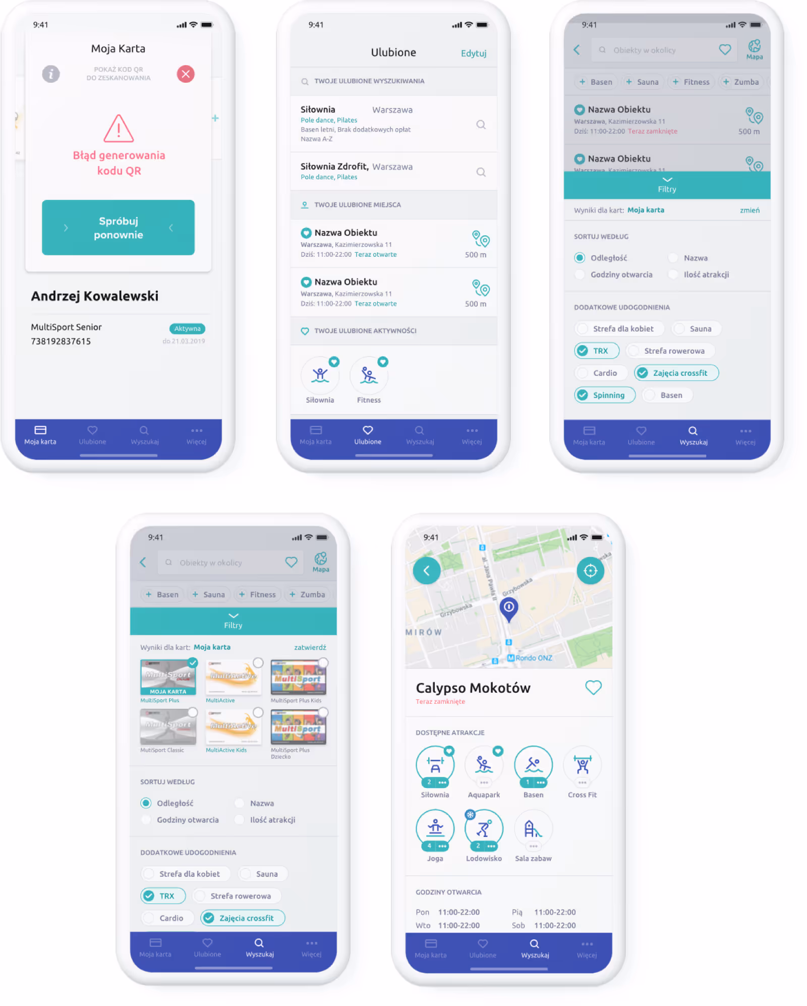 Projektowaliśmy ekrany aplikacji w oparciu o nowoczesny wizerunek marki i dostarczony brand manual. Staraliśmy się podkreślić nowoczesny charakter usług i produktów MultiSport korzystając z najnowszych tredów w projektowaniu produktów cyfrowych. Ekrany projektowaliśmy w taki sposób, aby można było wygodnie korzystać z aplikacji nawet na małych ekranach.