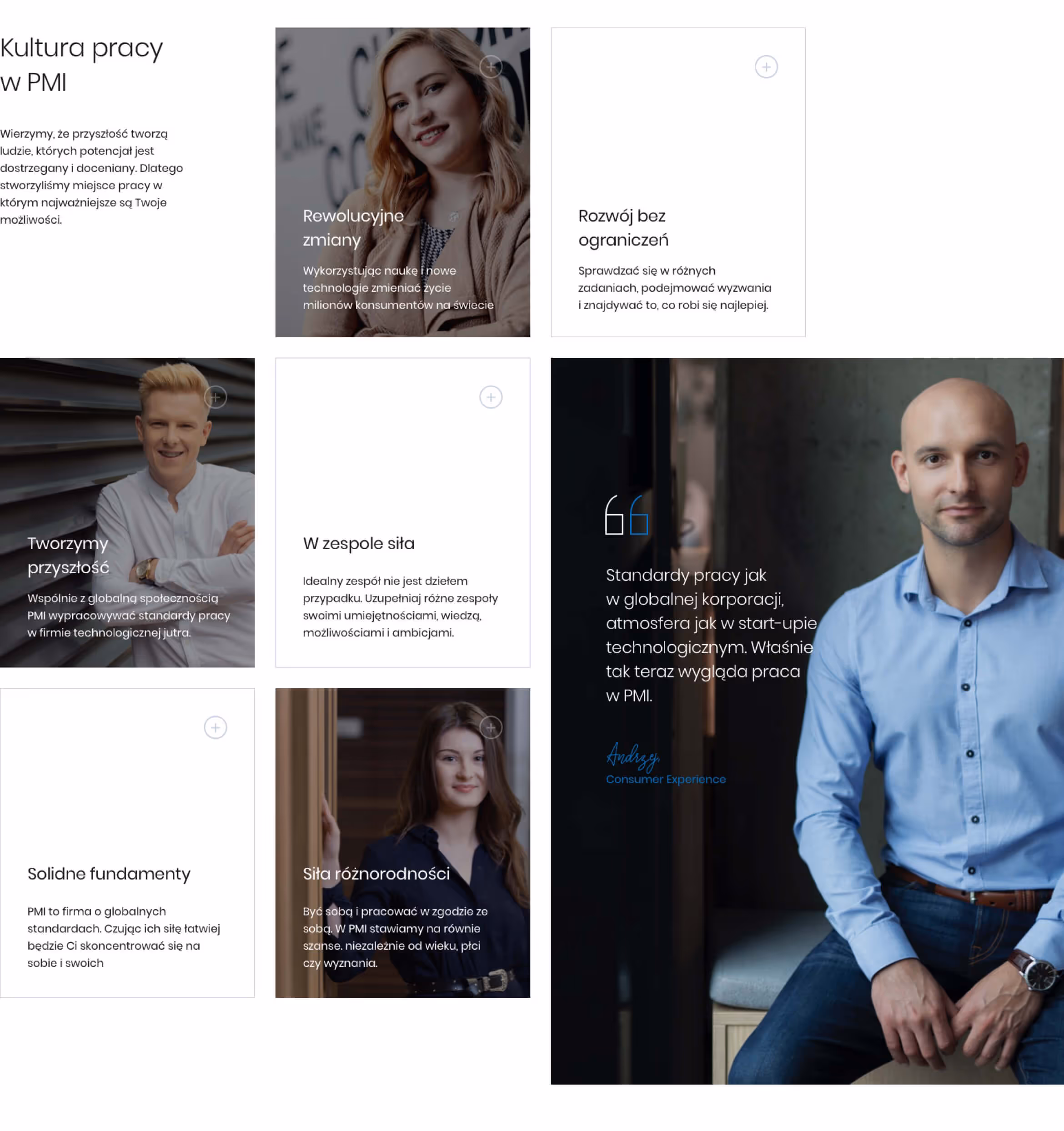 Naszym celem było zaprojektowanie nowoczesnej strony internetowej, która zachęci pracowników do poszukiwania i aplikowania na wolne miejsca pracy w PMI.