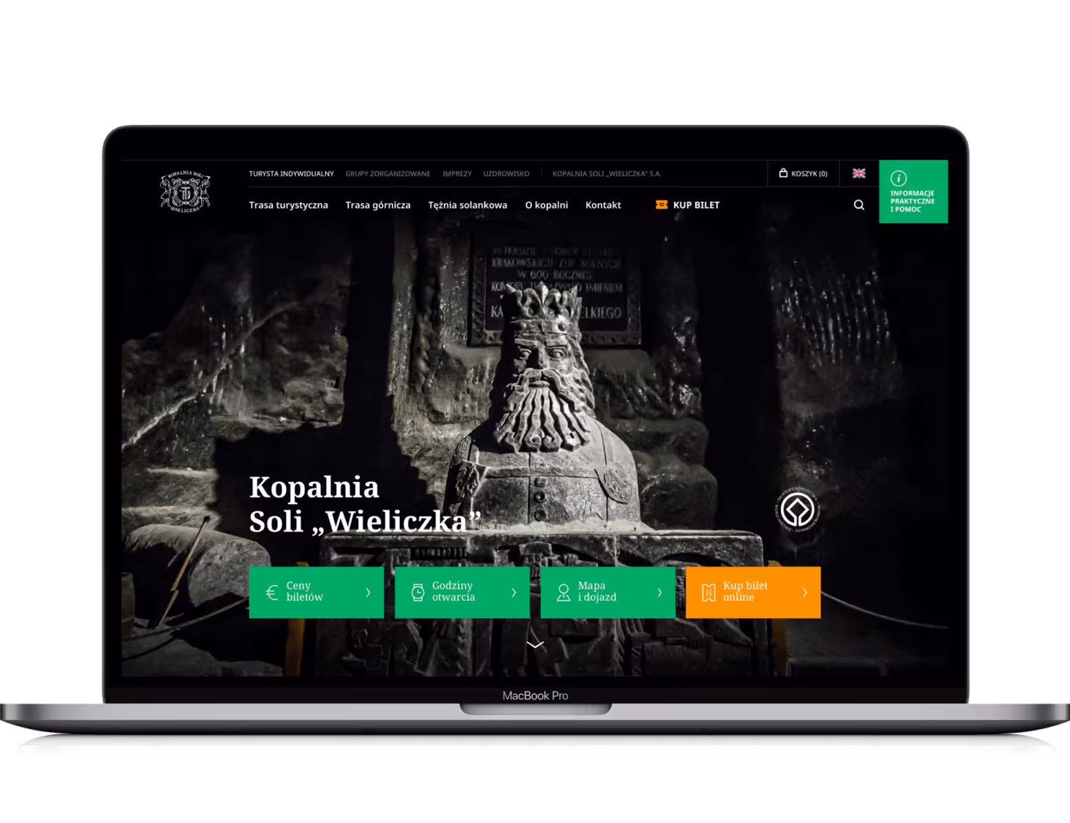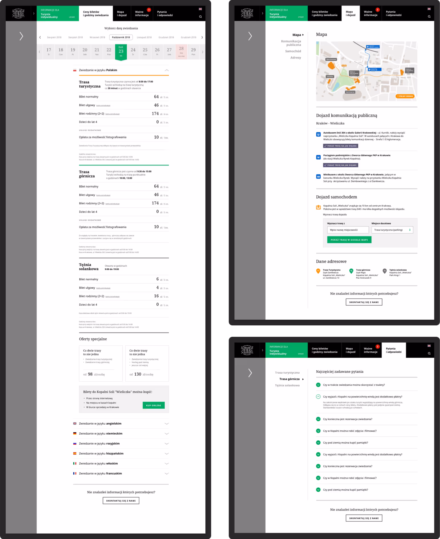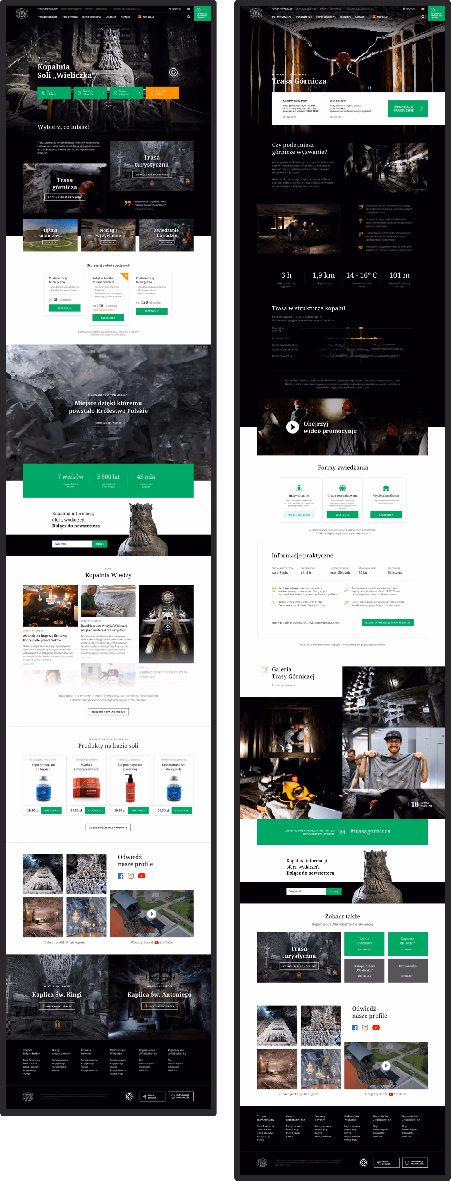 Chcieliśmy przykuć uwagę użytkowników tym co w Kopalni najpiękniejsze. Dlatego zdecydowaliśmy się użyć piękny zdjęć i video z wnętrza kopalni. Chcieliśmy, aby każdy element serwisu pasował do atmosfery “Wieliczki” - dlatego oparliśmy kolorystykę o czerń, biel i zielień. Czerń symbolizuje ciemność podziemi, biel odnosi się do naturalnego koloru soli, zieleń jest kolorem uzupełniającym i głównym CTA. Paletę uzupełniają odcienie szarości oraz kolory arertów i ostrzeżeń.
