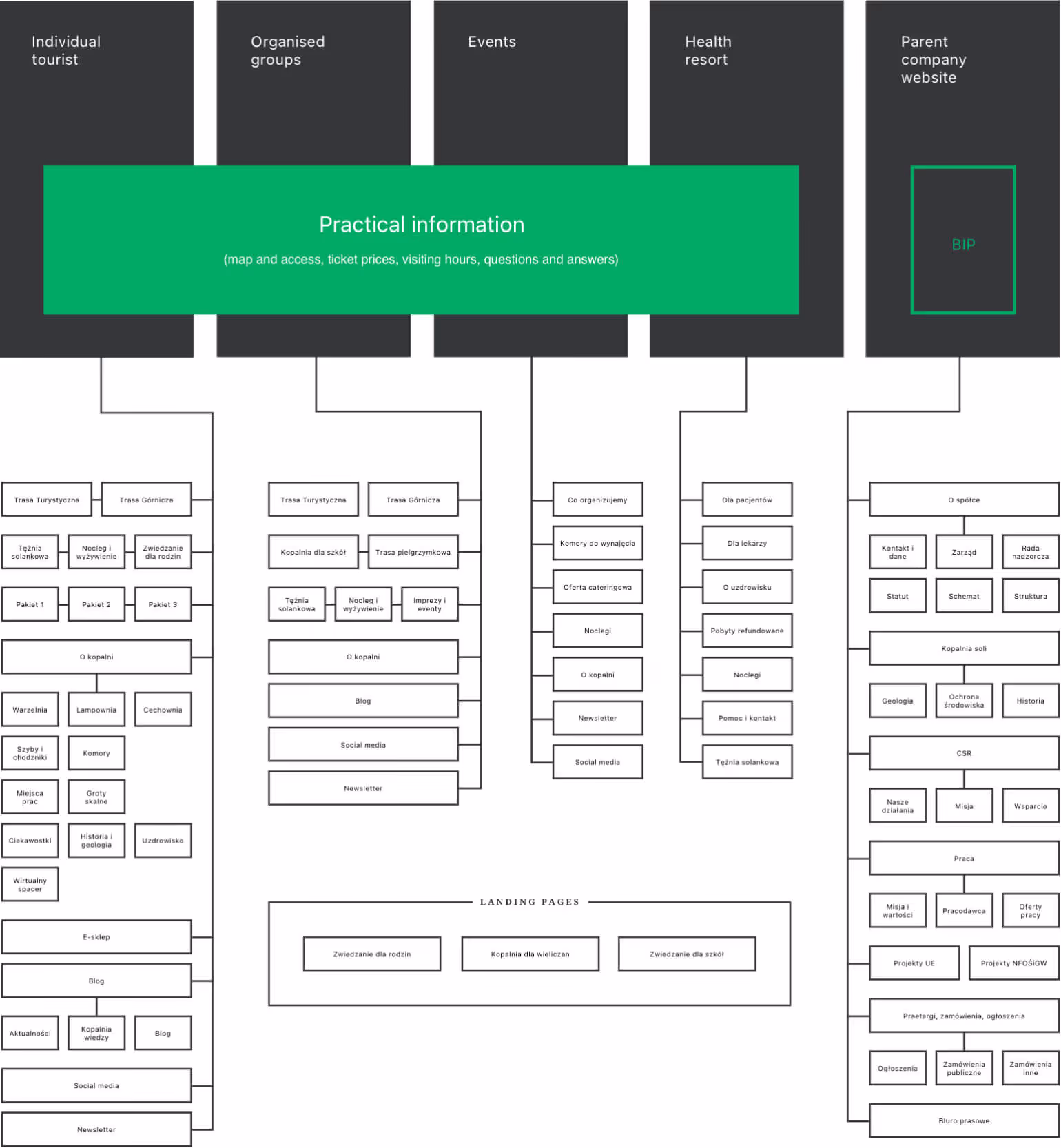 Przygotowaliśmy dwudniowe warsztaty oparty o metodę consumer journey połączoną ze wspólnym projektowaniem. Podczas warsztatów udało nam się określić dokładnie cele i priorytety dla architektury nowego serwisu. Warsztaty odbyły się w jednej z sal konferencyjnych na terenie kopalni. We wspólnej pracy uczestniczyło ponad 20 osób z różnych zespołów, zajmujących się na codzień pracą z turystami.